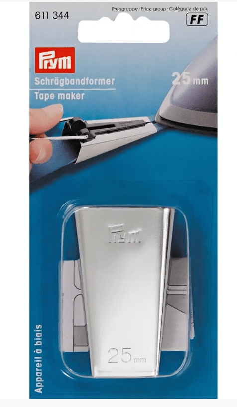 The practical Prym tape maker makes perfect forms of any length of bias binding possible, for binding fabric edges or patchwork quilts. By cutting the fabric strip at a 45 degree angle to the grain of the fabric, the bias binding is elastic and can be processed perfectly even on curves. After the fabric strips are cut and joined together, the material is introduced and pulled through the wide opening of the tape maker On the flat side of the useful aid the perfectly folded bias binding can be pulled out and can be smoothed out directly with the iron. So, making the bias binding is quick and reliable and it can be easily rolled up for further use.