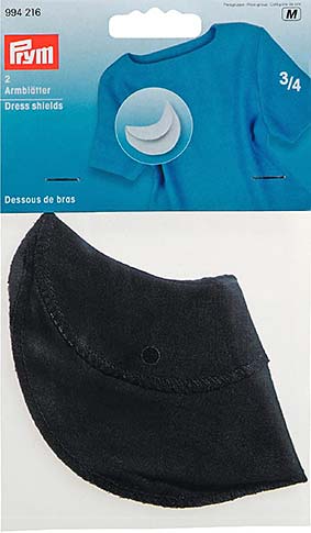 To prevent sweat stains in short-sleeved ad sleeveless outer garments, such as T-shirts and tops, we provide 100% cotton dress shields. The absorbent shields can be sewn in like patches or secured with safety pins for dress shields. They are available from the Prym range in sizes ½ and ¾ in black or white. The dress shields can be washed at up to 60 degrees. Each card contains 2 pieces.