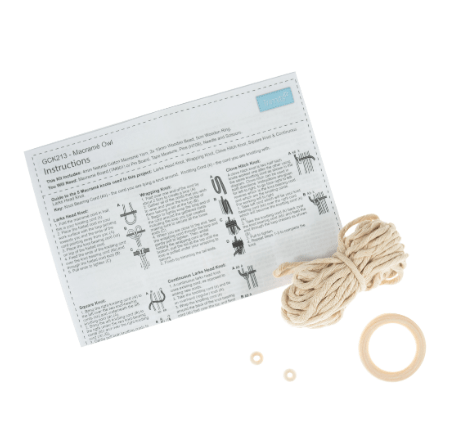 Macramé kit. These kits are the perfect introduction to the art of Macramé. Kit includes: 8m x 3mm, natural, cotton, Macramé yarn; 5cm wooden craft ring; 2 x 1cm wooden beads and instructions in three languages (EN, FR, GER). Approximate finished size: (w/h) 7 x 21.5cm.