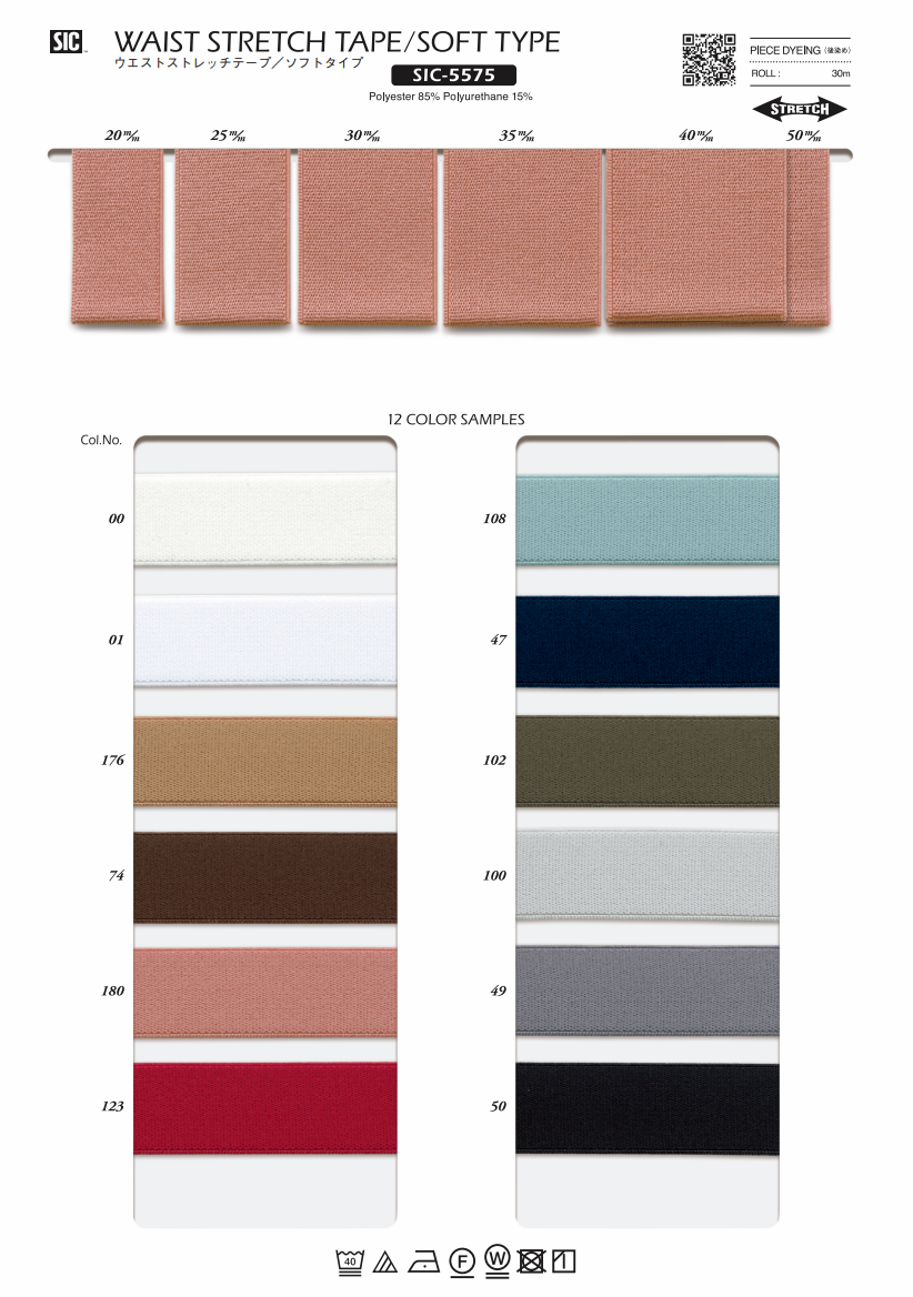 Soft Type SIC-5575 solves the problem. This Polyester Tape blends 85% polyester with 15% polyurethane for gentle, rebounding stretch. Piece-dyed in neutral 176 beige, it disappears inside waistbands, cuffs, or lingerie.