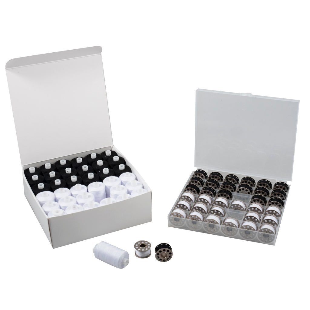 36 black and white spools holding 228m (250yds) of polyester thread. Including matching 36 black and white thread on metal bobbins.